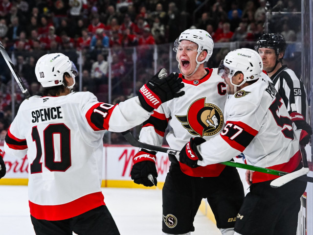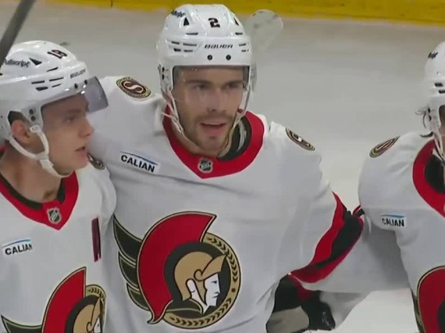 Watch as Ottawa Senators’ Artem Zub dekes out Montreal Canadiens’ Samuel Montembeault in front of the net after an amazing pass from Brady Tkachuk to gain the lead late in the first period.