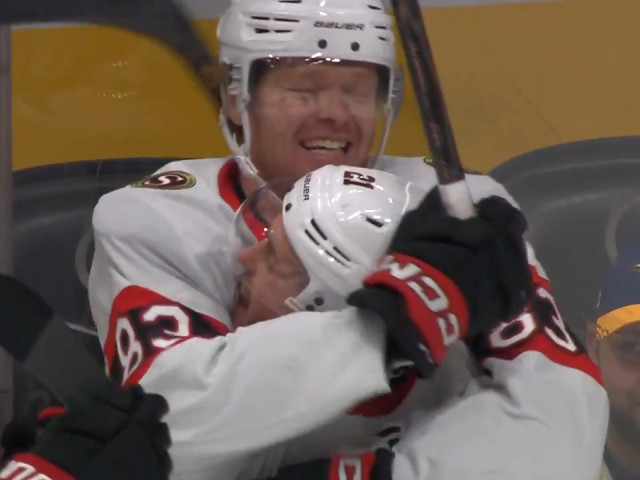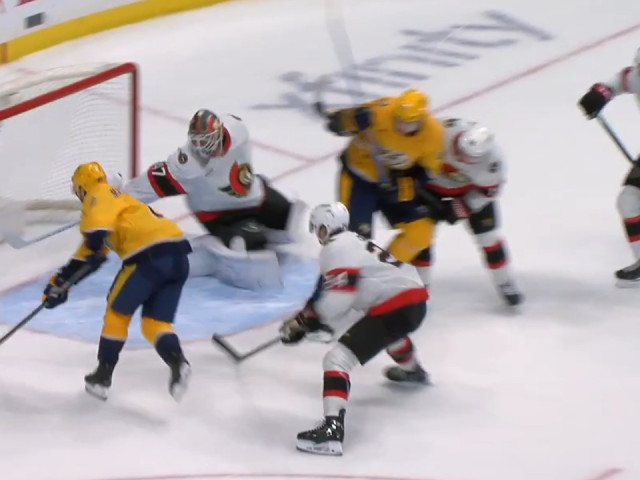 Ottawa Senators netminder James Reimer reaches back to stun Nashville Predators forward Jonathan Marchessault with a miraculous stick save late in the second period.